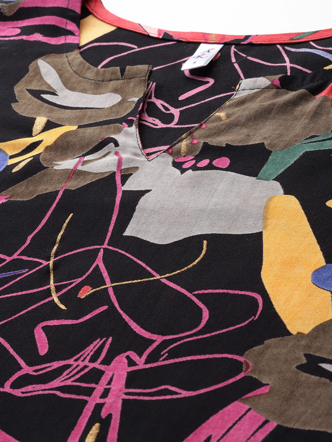 • Black and multicolored floral print Tunic, has a round neck, has three-quarter, regular sleeves