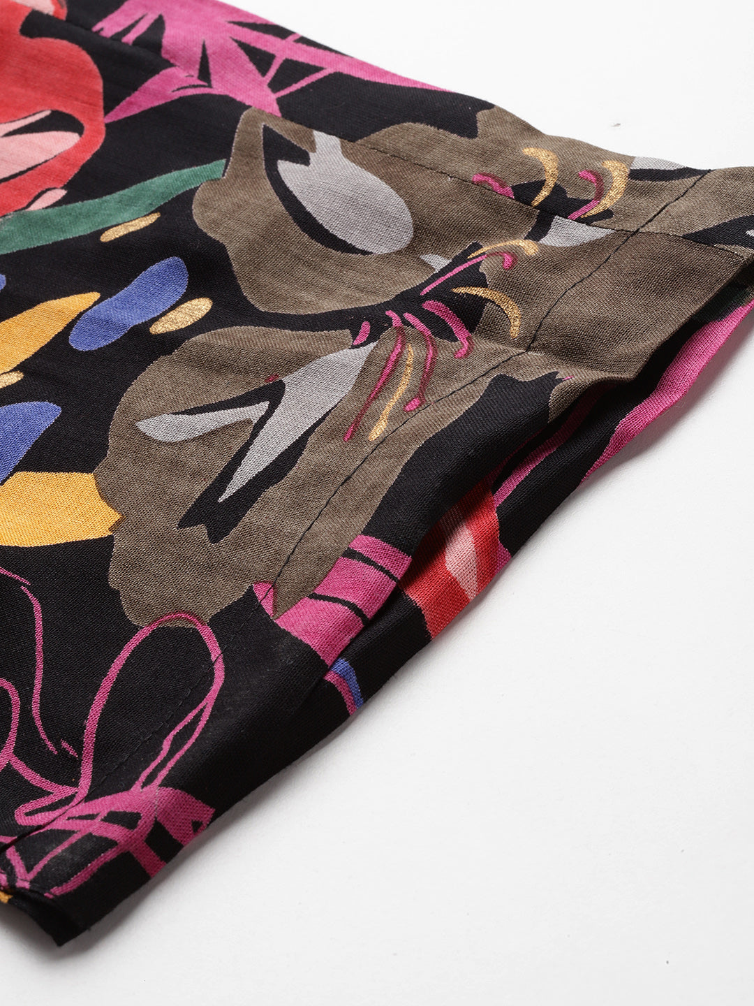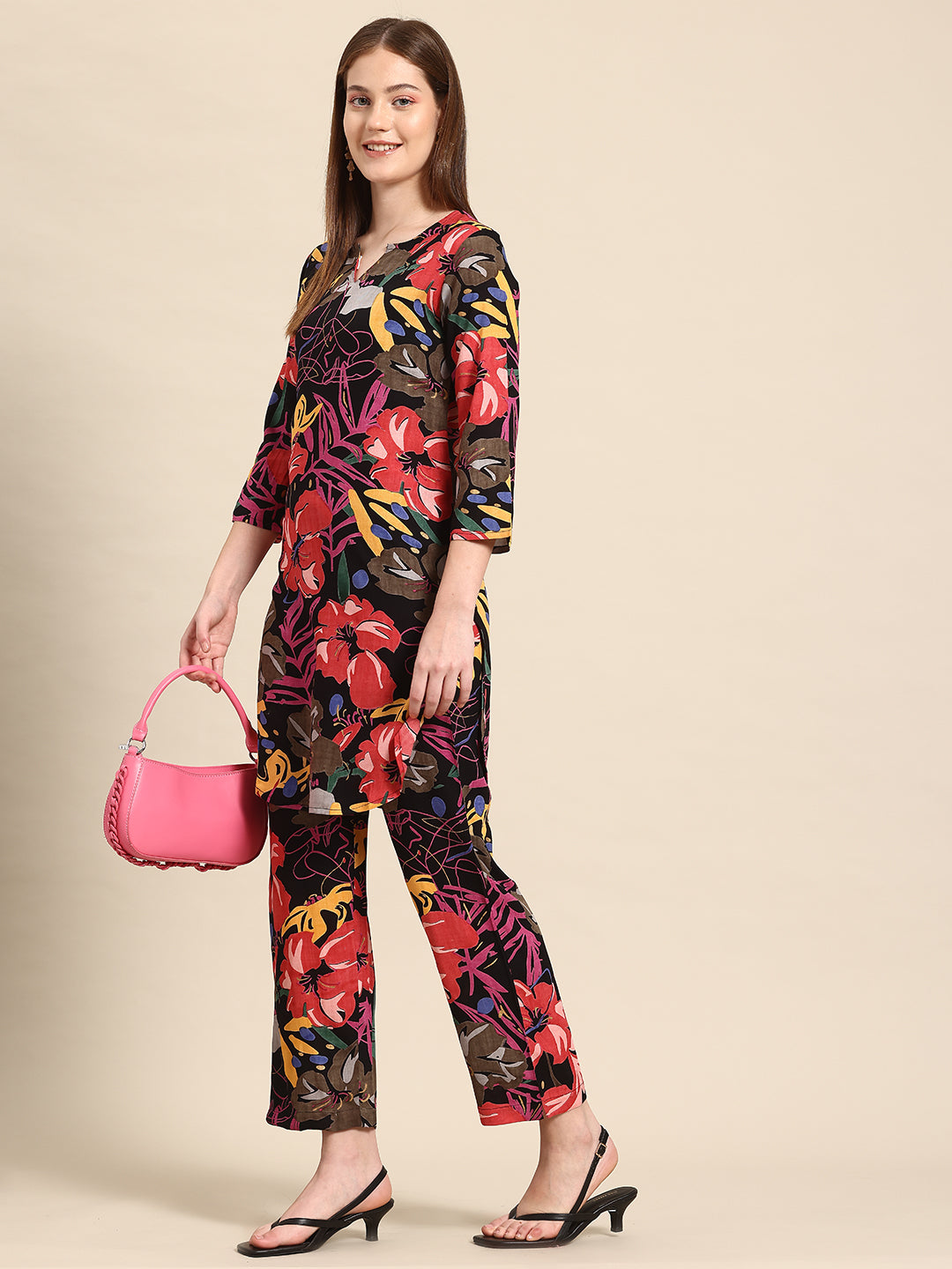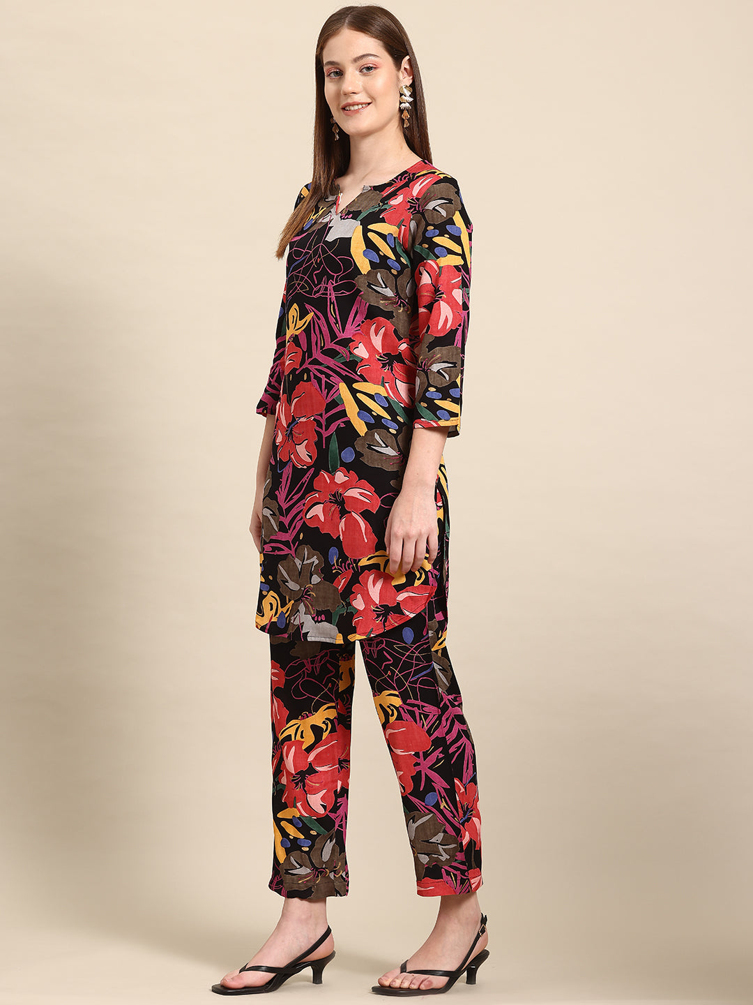 Product Details  This co-ords consists of a Tunic & Trousers Black and multicolored floral print Tunic, has a round neck, has three-quarter, regular sleeves  Black and multicolored floral print Trousers,...