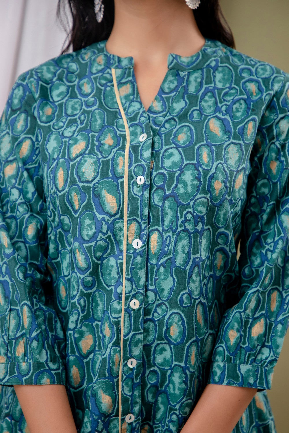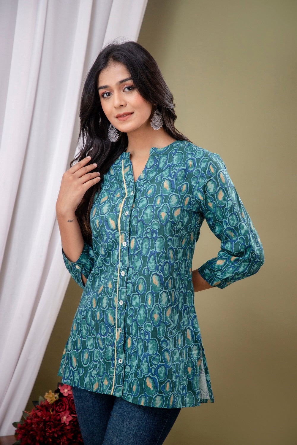 Product Details  Green regular shirt style top Floral print Mandarin collar, three-quarter, regular sleeves sleeves Knitted and woven Button closure Material & Care Machine Wash Specifications Sleeve Length: Three-Quarter Sleeves Neck: Mandarin...