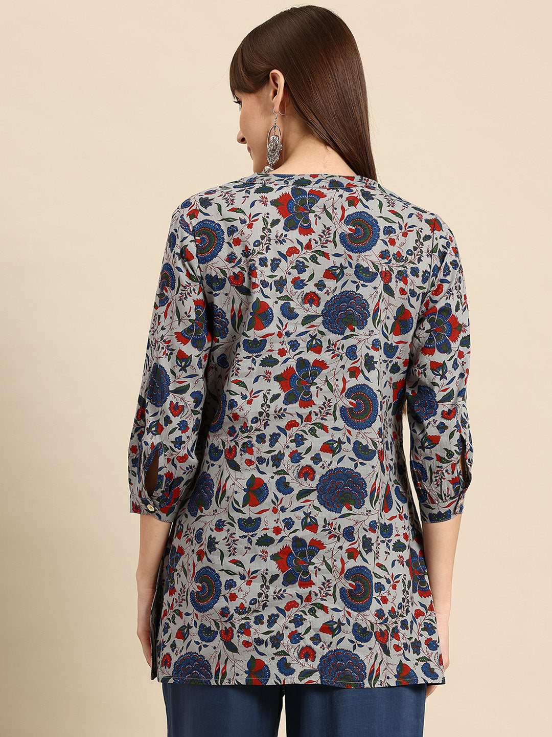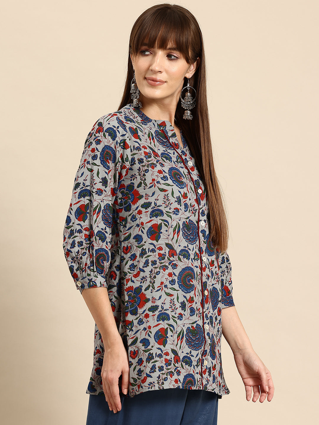 Product Details  Floral print Mandarin collar, three-quarter, cuffed sleeves sleeves Knitted and woven Button closure   Material & Care CottonMachine Wash Specifications Sleeve Length: Three-Quarter Sleeves Neck: Mandarin Collar Type:...