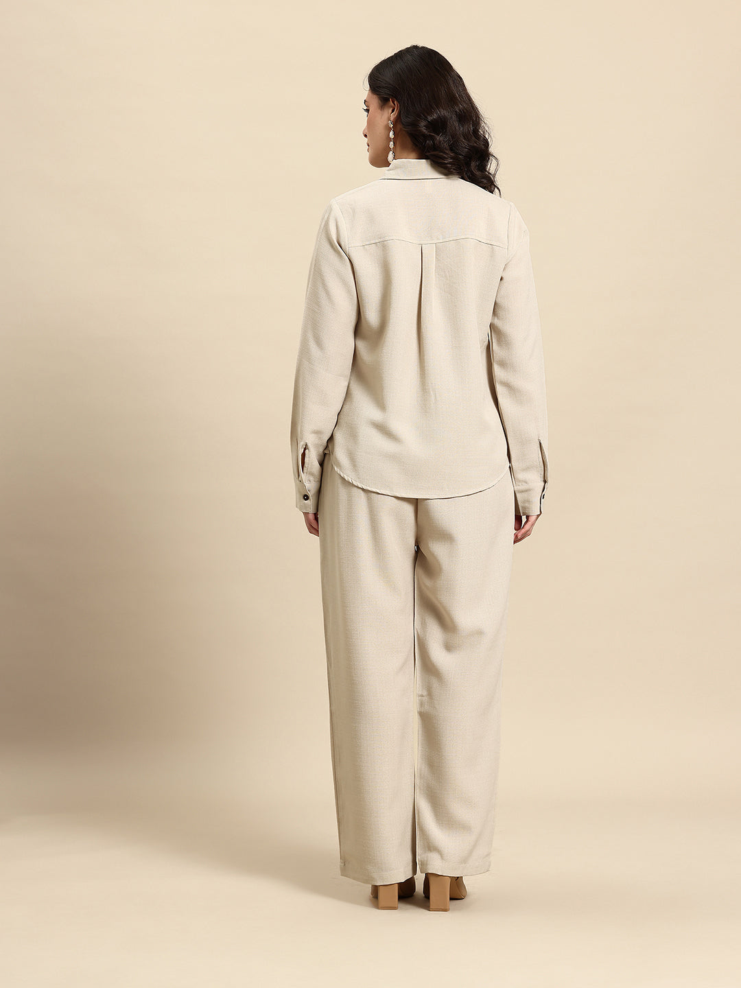 Product Details  These Co-ords consist of a shirt and a pair of trousersTop design: Beige textured shirt with embroidered detail  Spread collar Long, cuffed sleeves  Button closure Curved hem  Bottom...