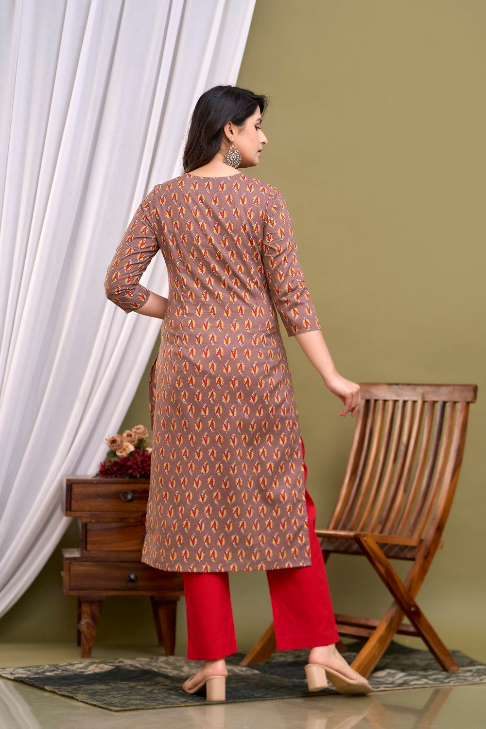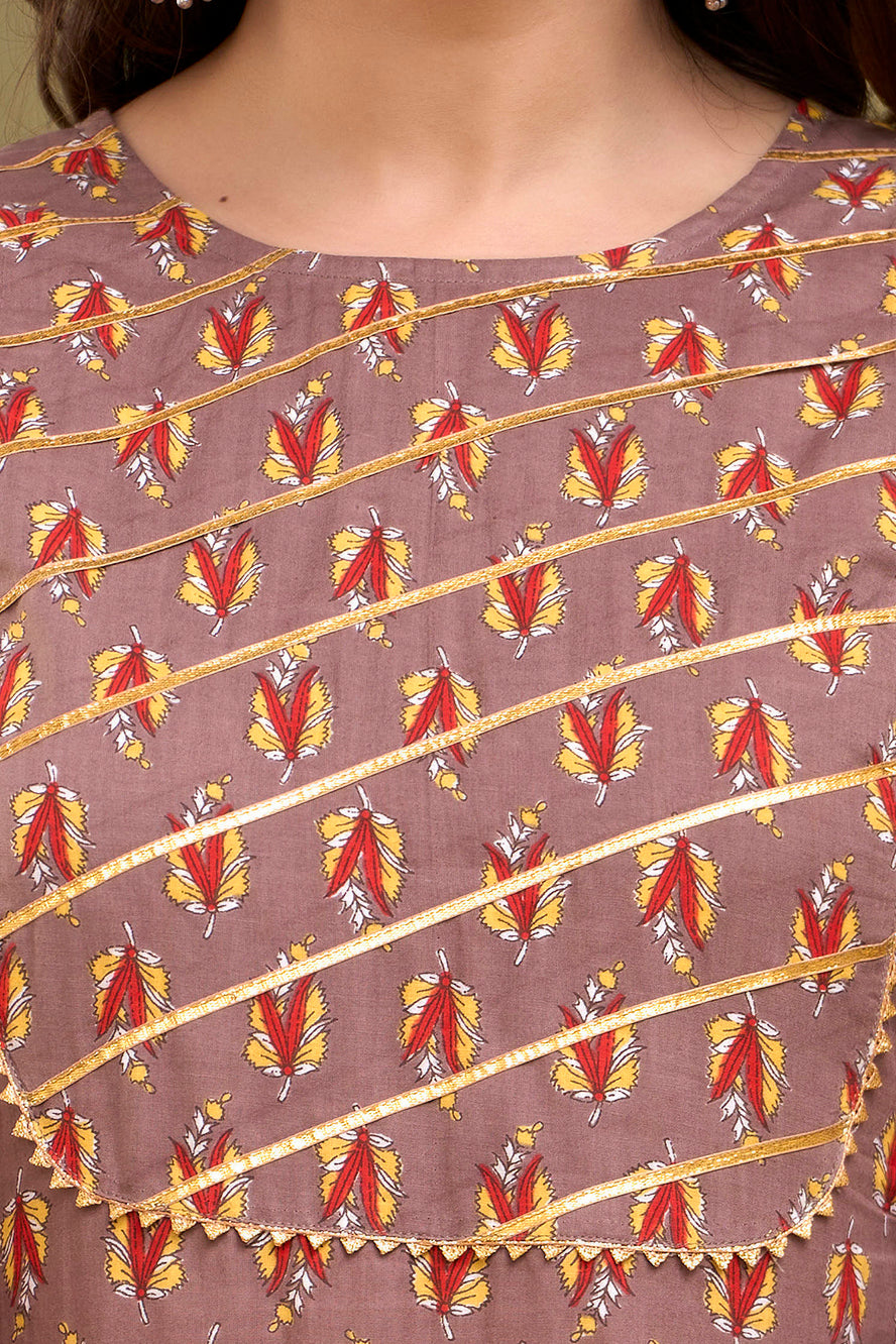 Product Details  Beige printed Kurta with TrousersKurta design: Ethnic motifs printed Straight shape Regular style Round neck, three-quarter regular sleeves Na pockets gotta patti detail Calf length length with straight...