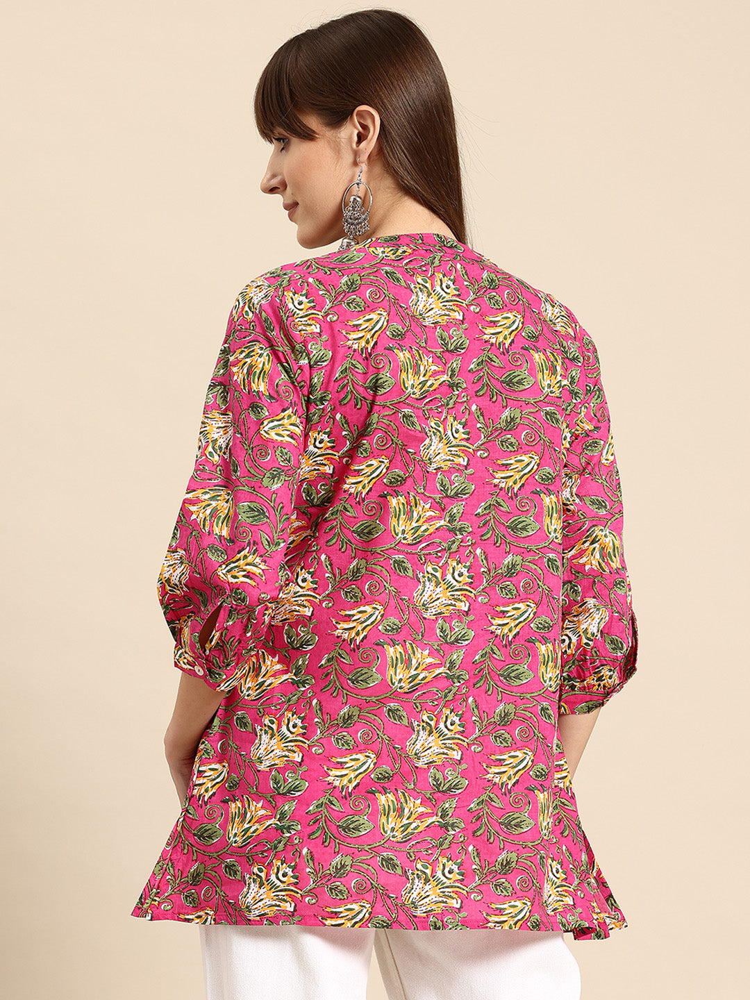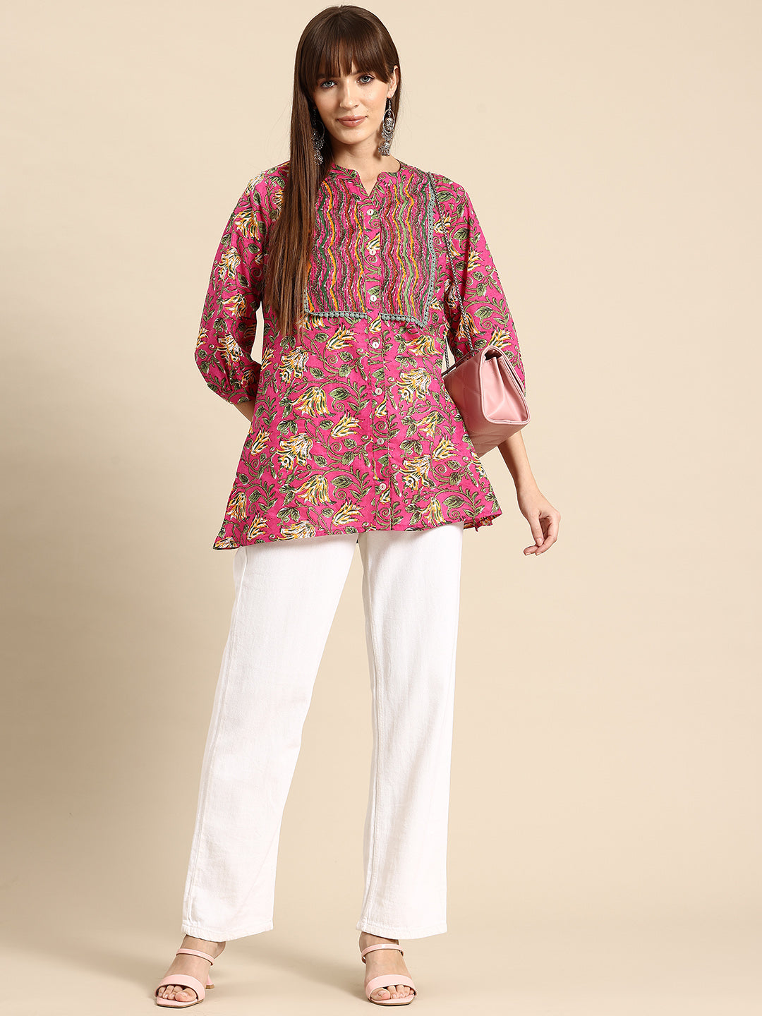 Product Details  Pink regular a-line top Floral print Mandarin collar, three-quarter, cuffed sleeves sleeves Lace inserts detail Knitted and woven Button closure Material & Care Pure CottonFirst Wash Hand WashThereafter...