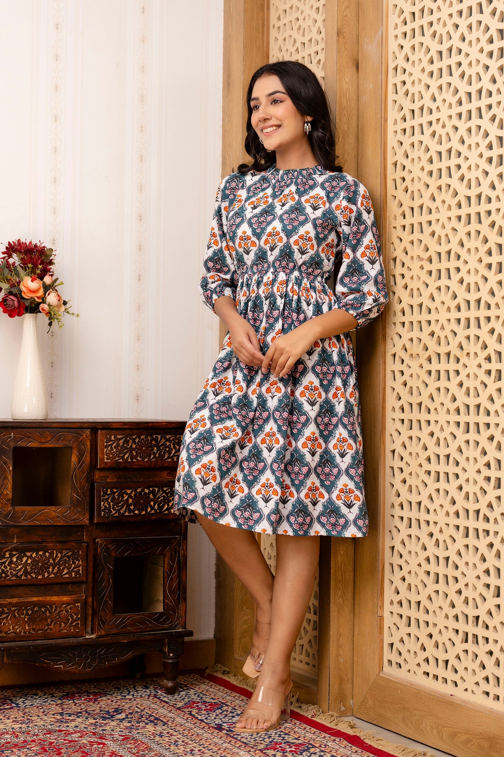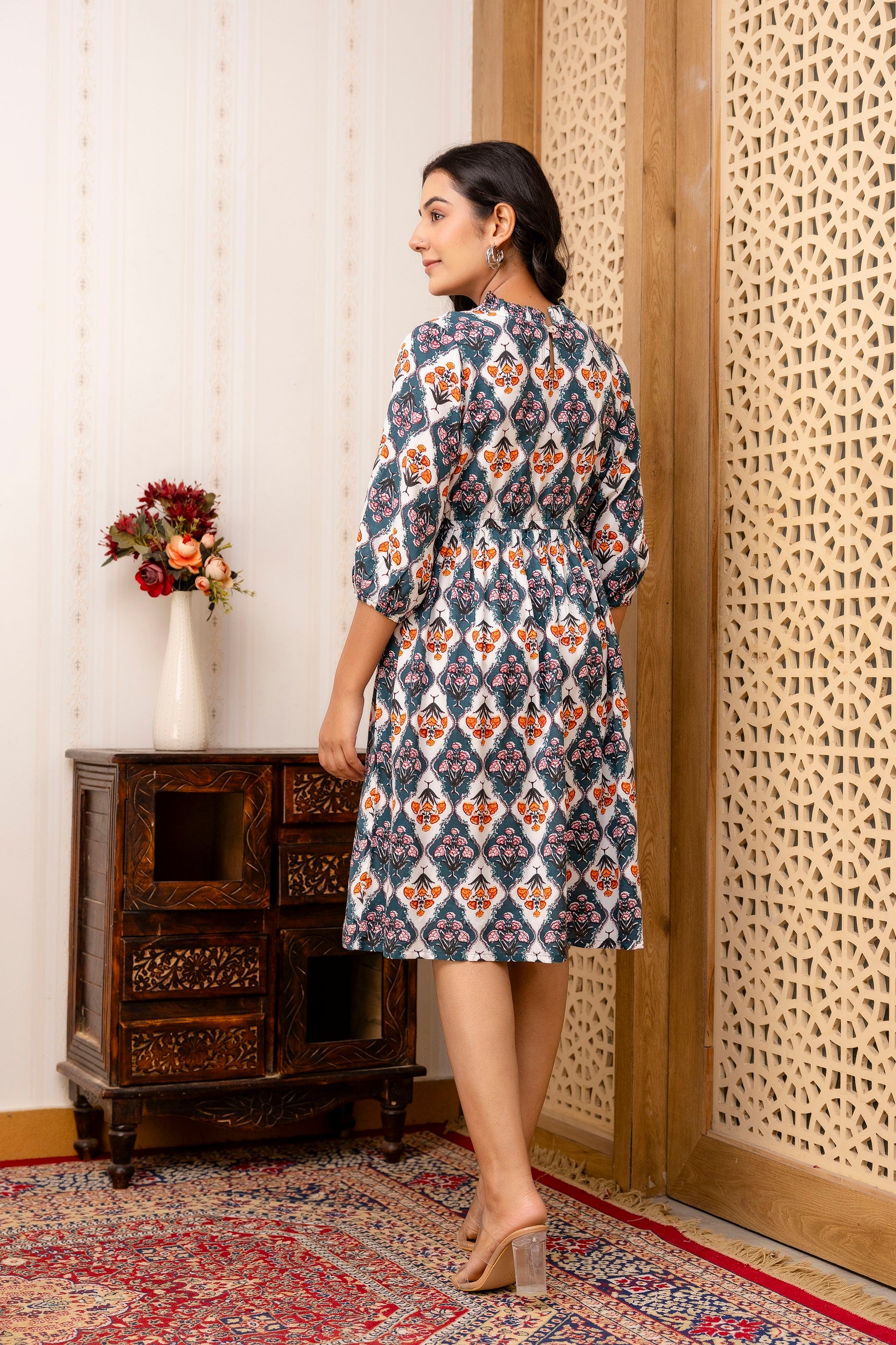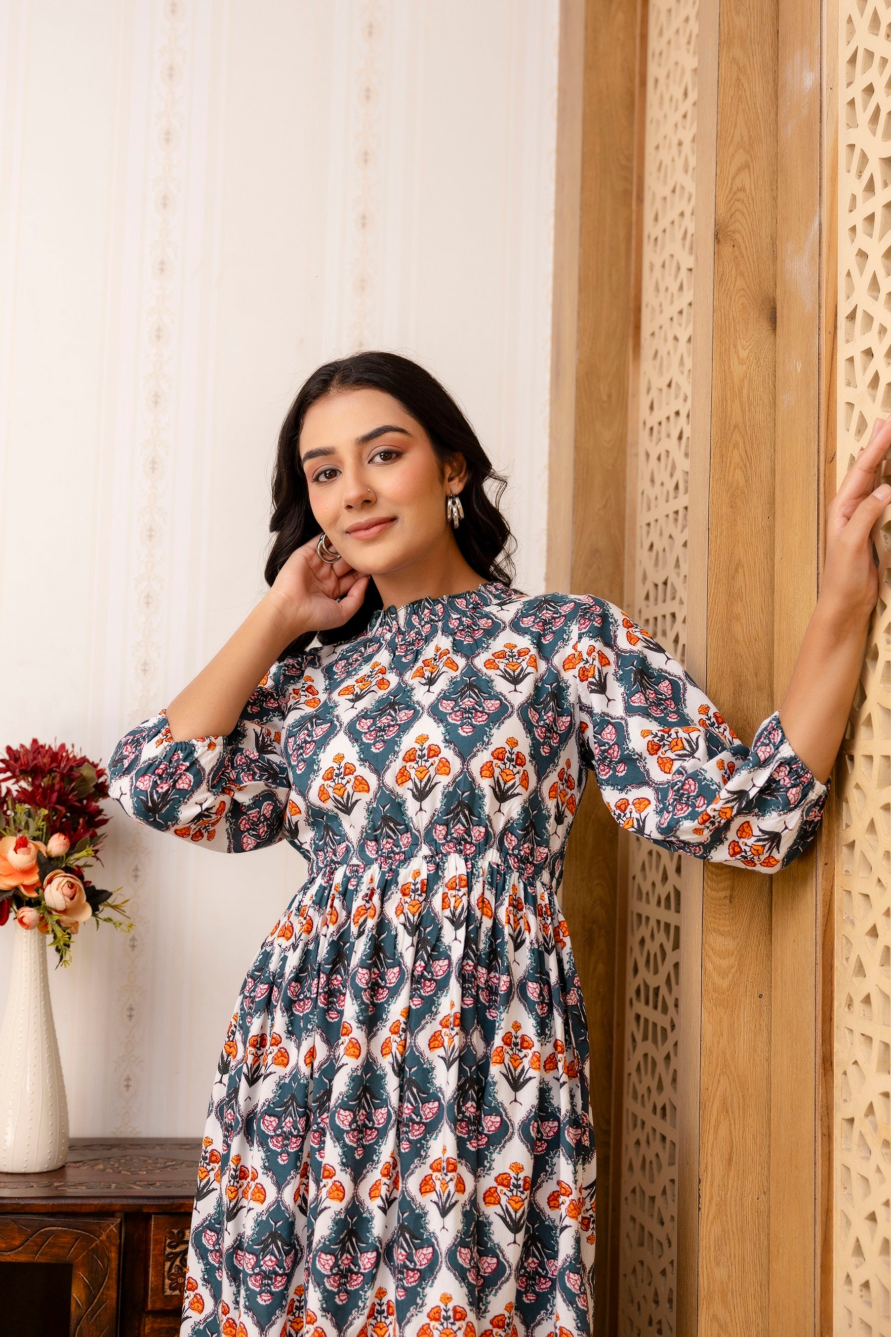 Product Details  Dark Green and white ethnic Dress Floral Printed Fit & Flare Shaped Round neck Three-Quarter Sleeves Flared hem Button closure Material & Care Viscose RayonFirst Wash Hand WashMachine...
