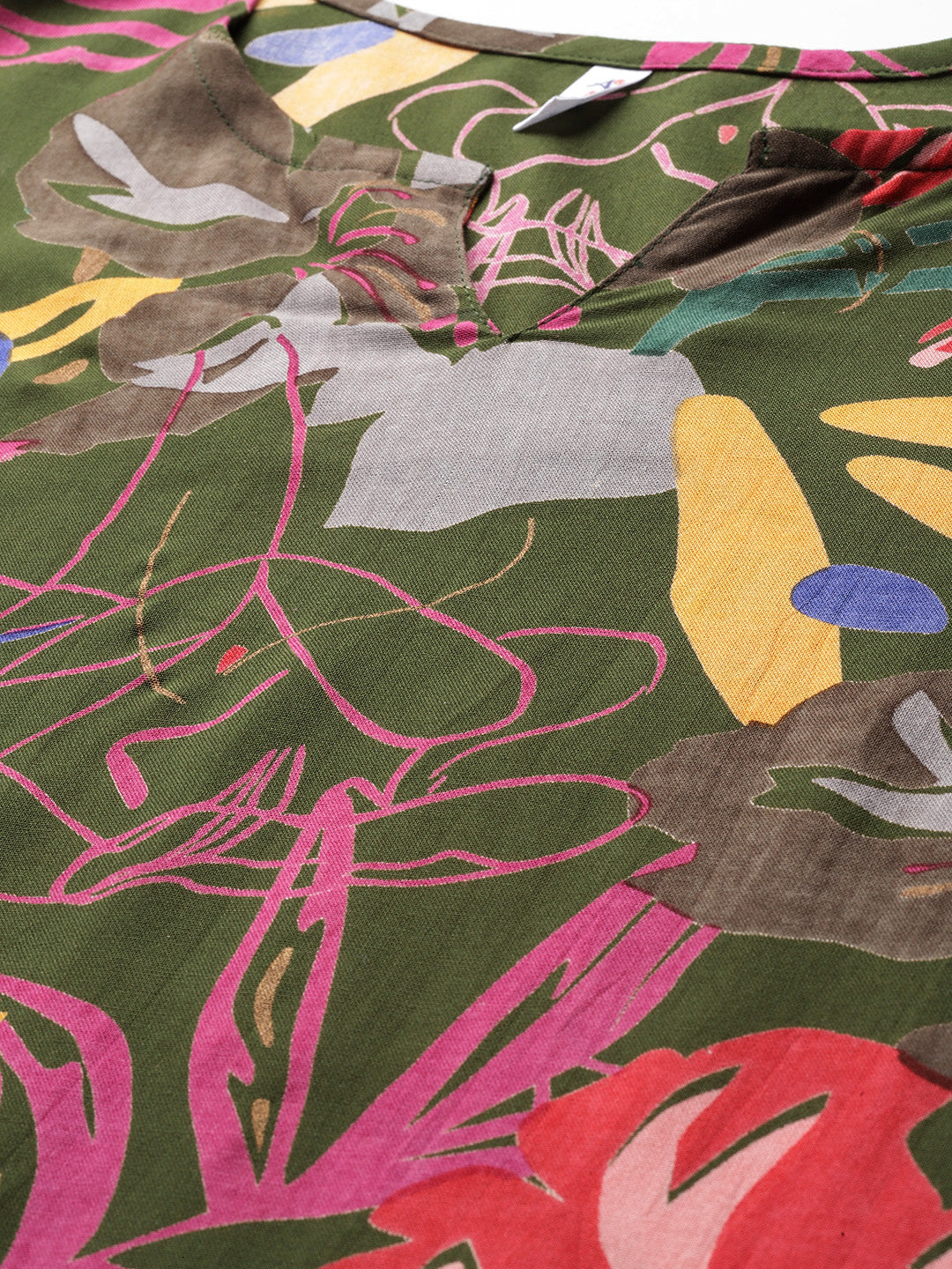 • Green and multicolored floral print Tunic, has a round neck, has three-quarter, regular sleeves