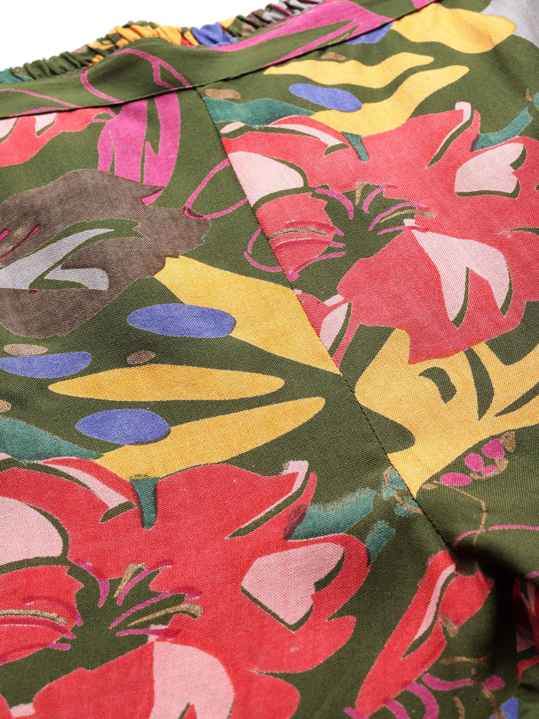 • Green and multicolored floral print Trousers, has a partially elasticated waistband with a slip-on closure