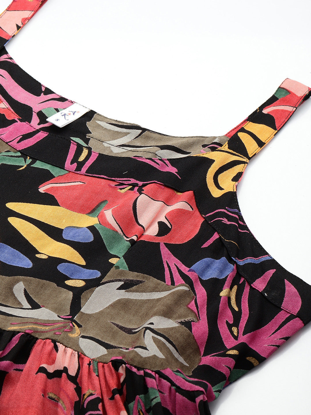 Product Details  Black floral print fit and flare dress Round neck Sleeveless, shoulder straps Midi length Flared hem Material & Care Viscose RayonMachine Wash Specifications Fabric: Viscose Rayon Hemline: Flared...