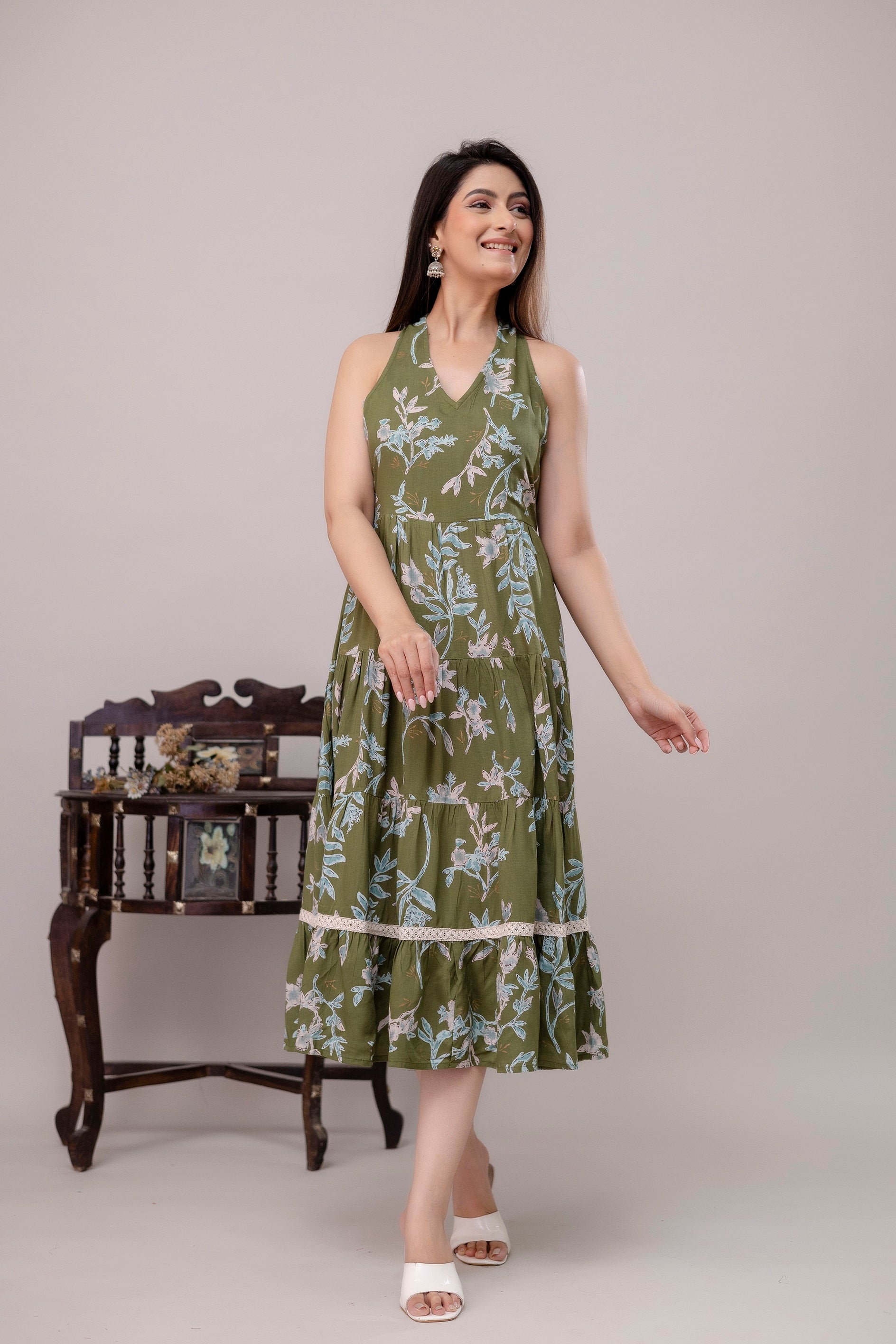 Green Floral Printed Tiered A-Line Midi Ethnic Dress
