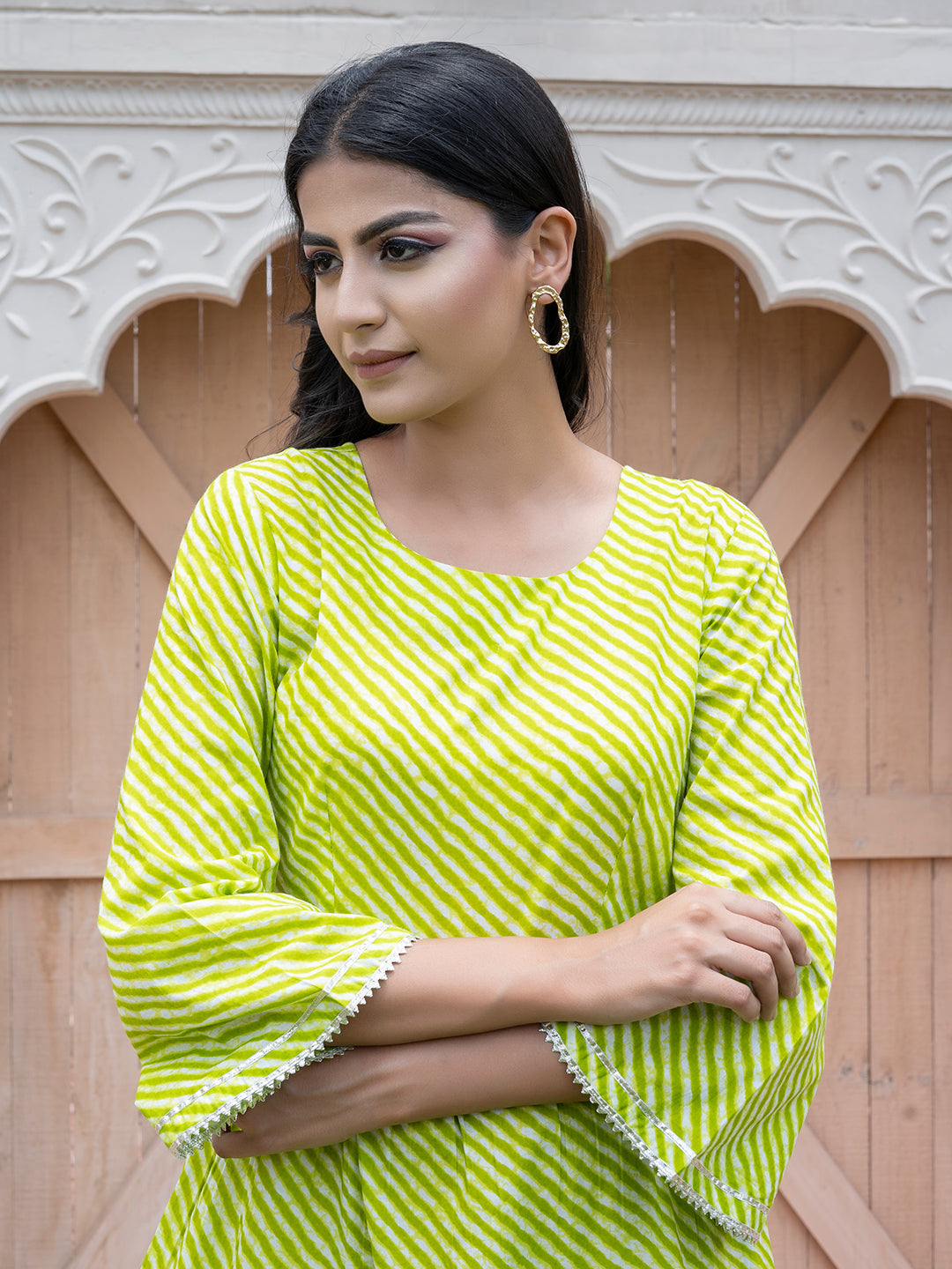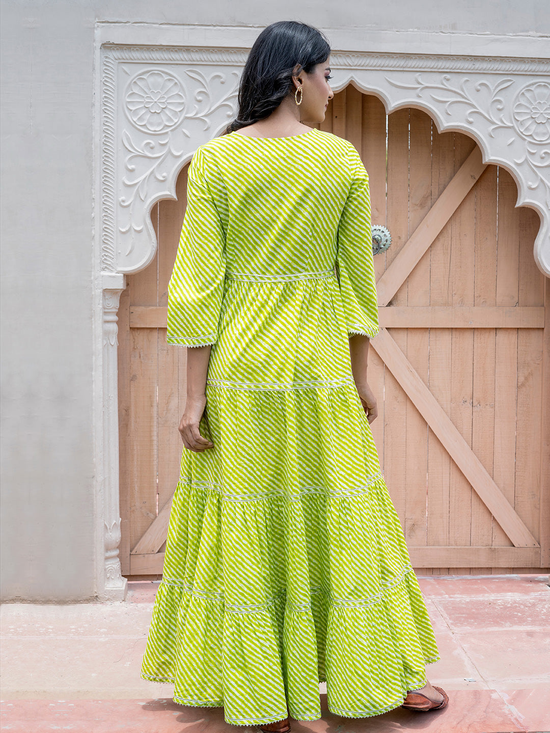 Green Lehariya striped woven maxi dress, has a round neck, three-quarter sleeves, an attached lining, and flared hem