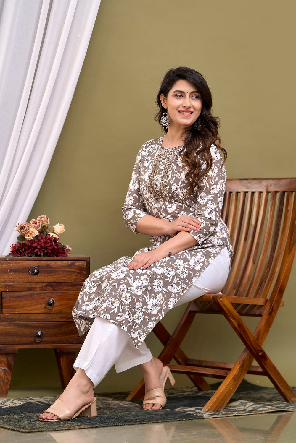 Product Details  Floral Printed Regular Thread Work Kurta With Trousers Kurta design: Floral printed Straight shape Regular style Round neck, three-quarter regular sleeves Na pockets thread work detail Calf length...