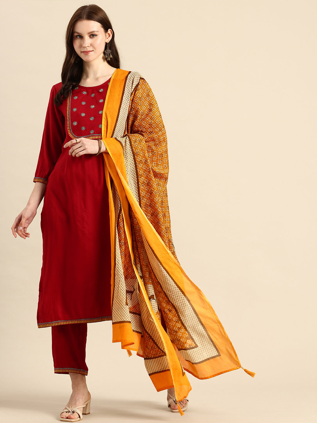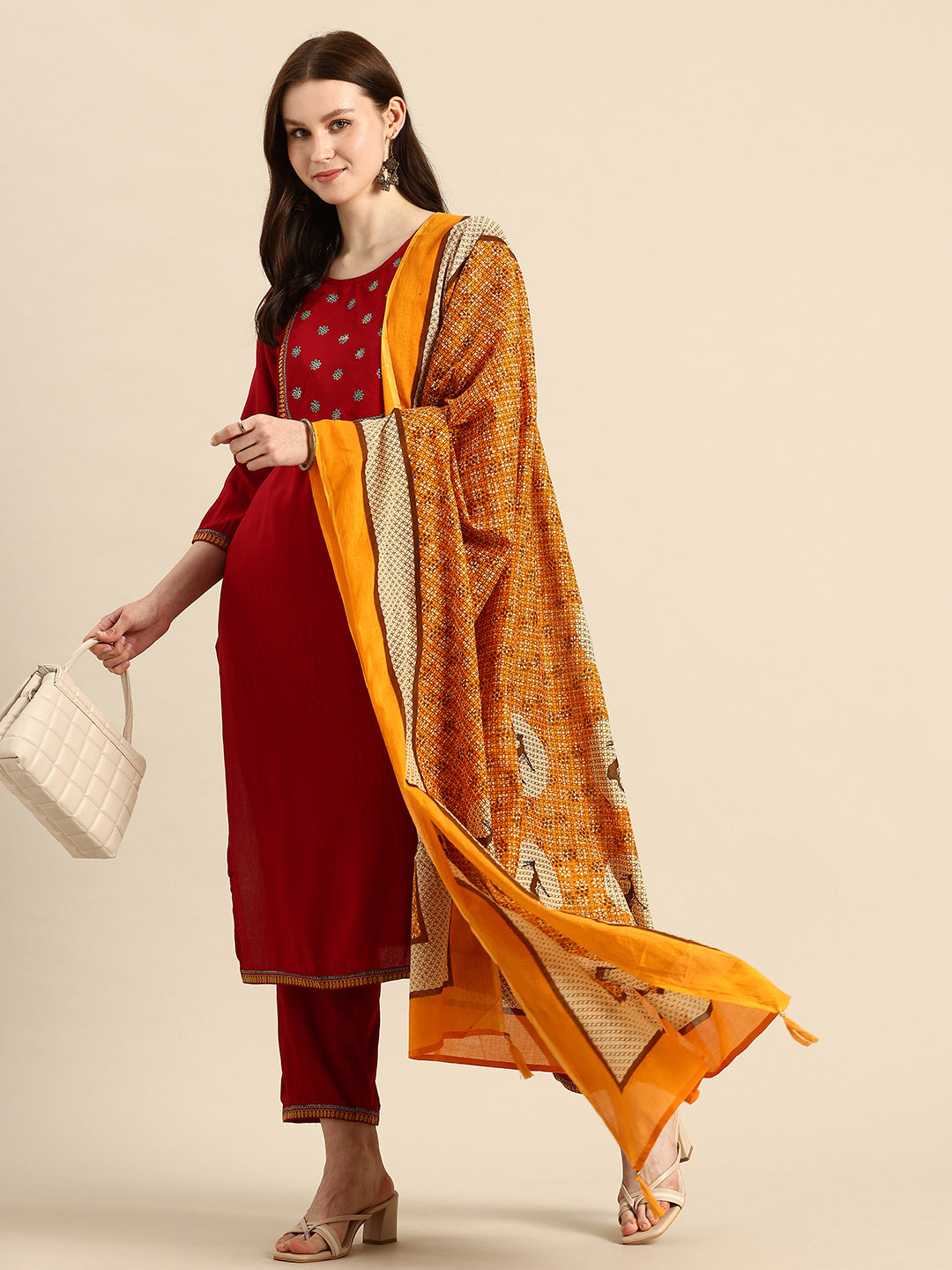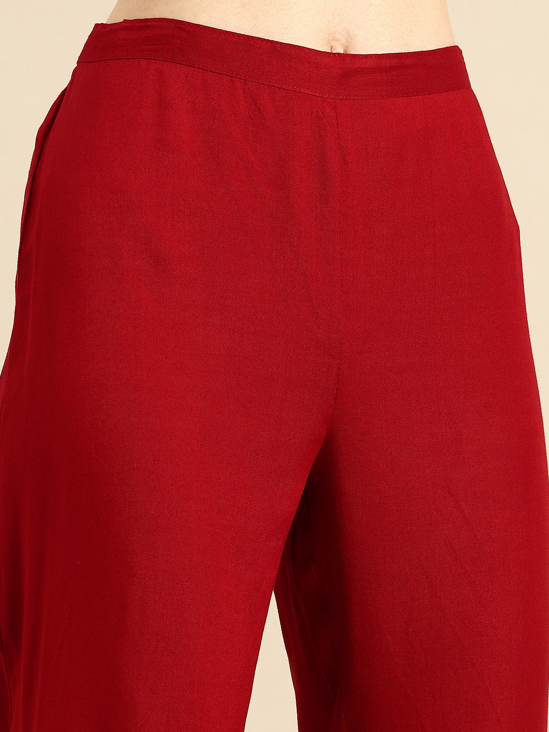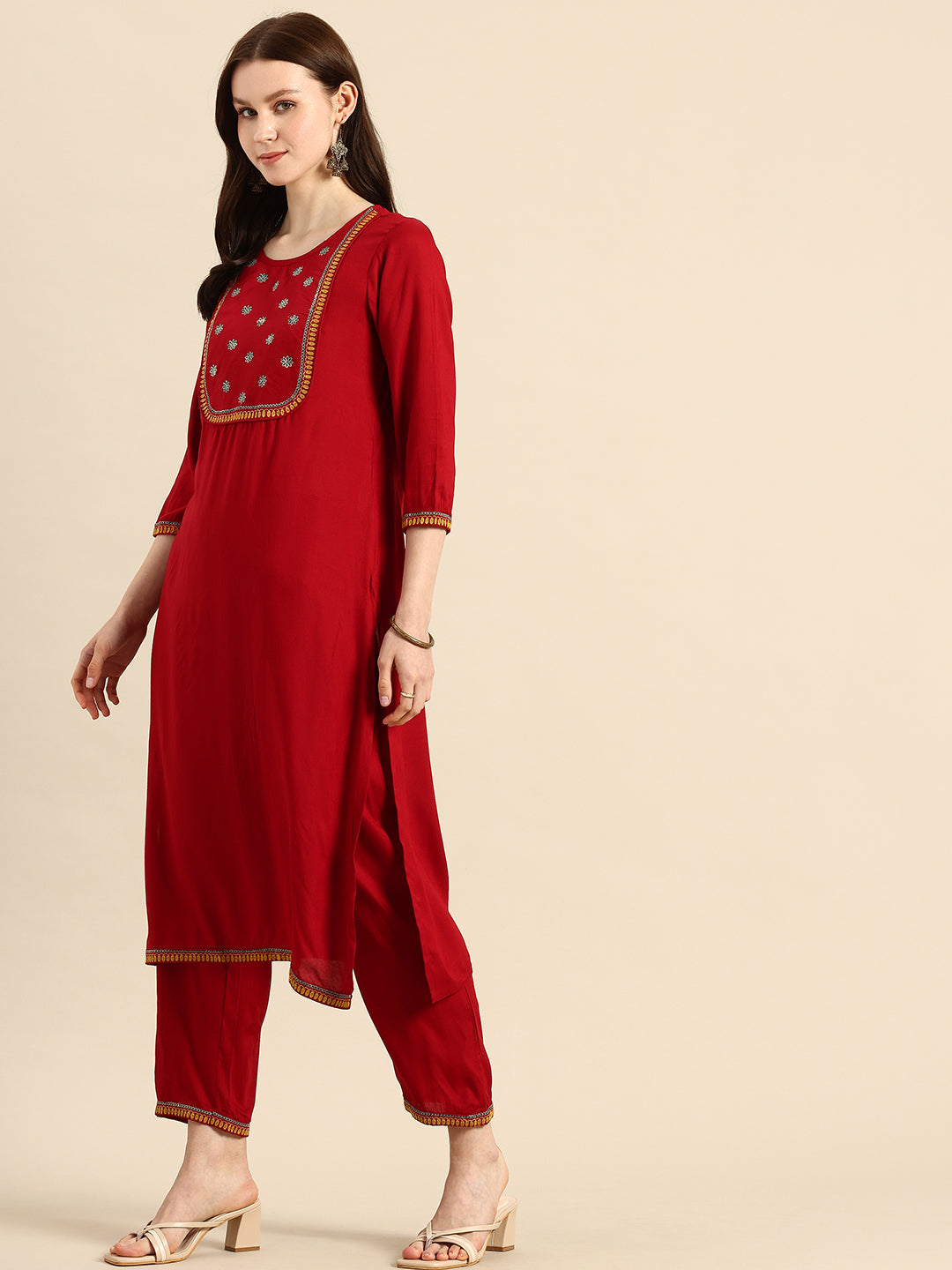 Kurta design: Floral embroidered Straight shape Regular style Round neck, three-quarter regular sleeves Calf length length with straight hem Viscose rayon machine weave fabric Trousers design: Solid Trousers Partially elasticated...