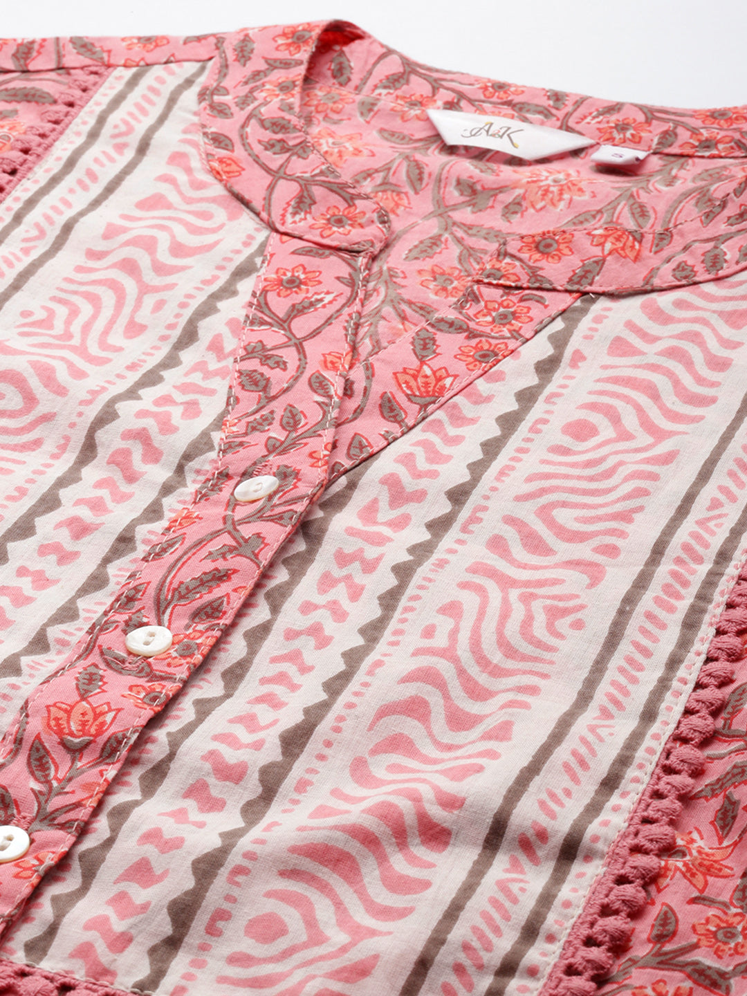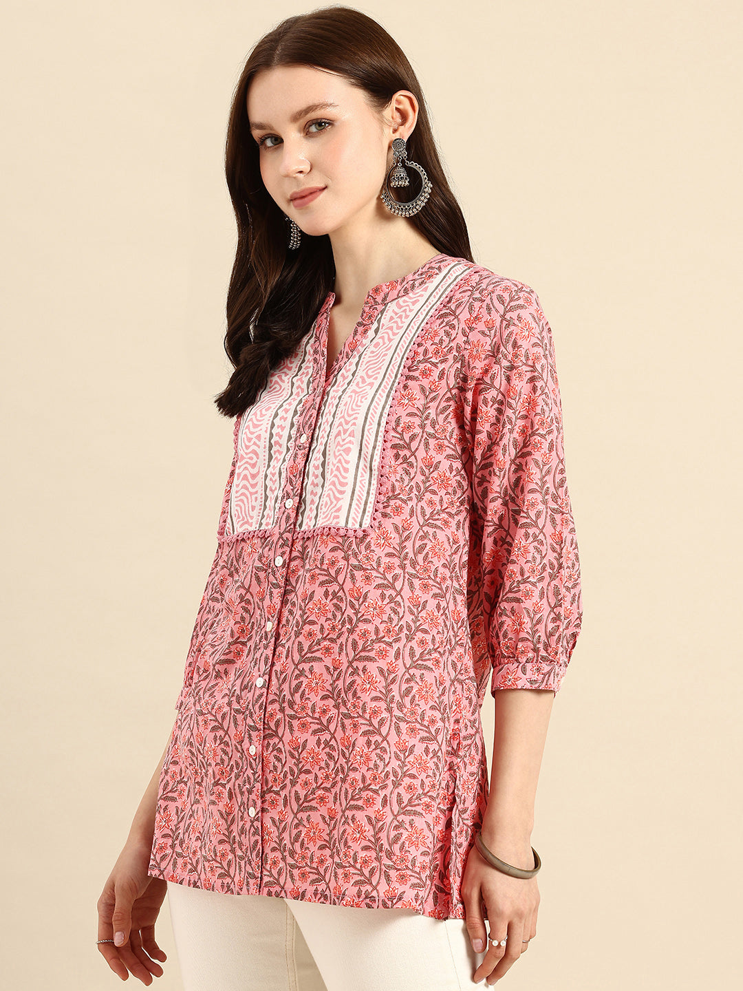 Pink Floral Print Mandarin Collar Pure Cotton Top