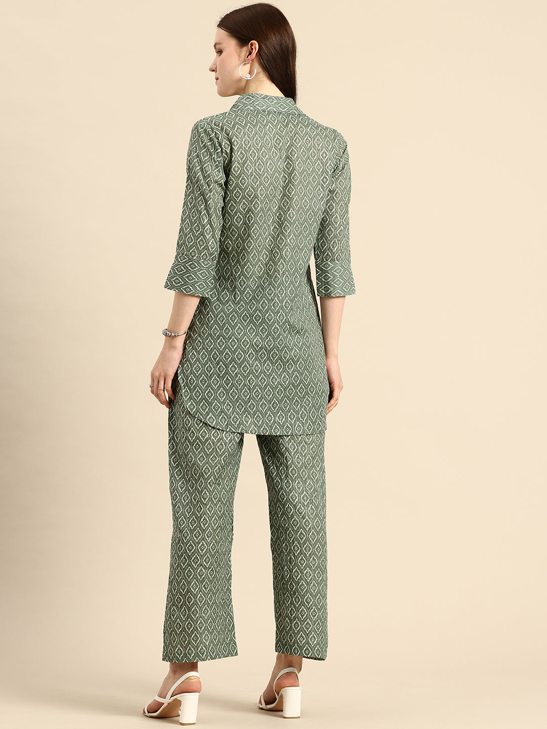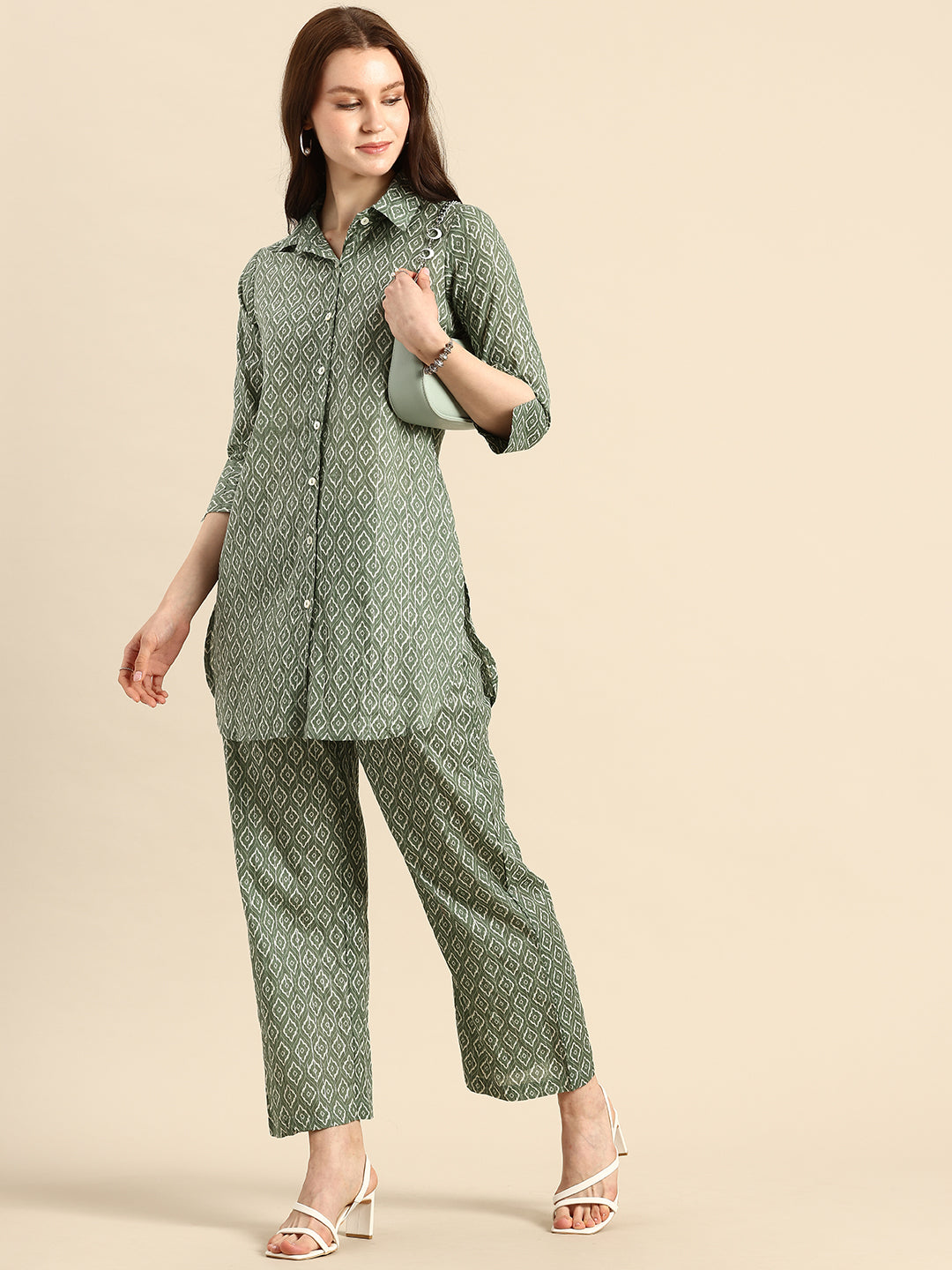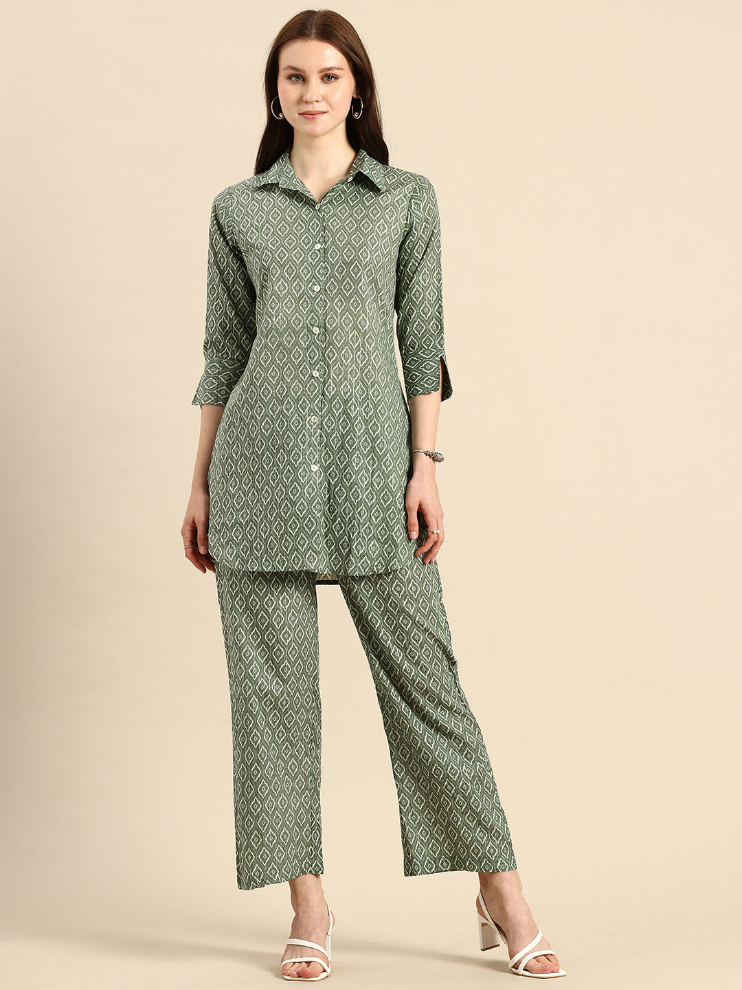Product Details  This co-Ord consists of Shirt and trouserGreen and beige printed Shirt, has shirt collar, three-quarter sleeves, button closure regular waist hemGreen and beige printed mid-rise trouser, slip-on closure...