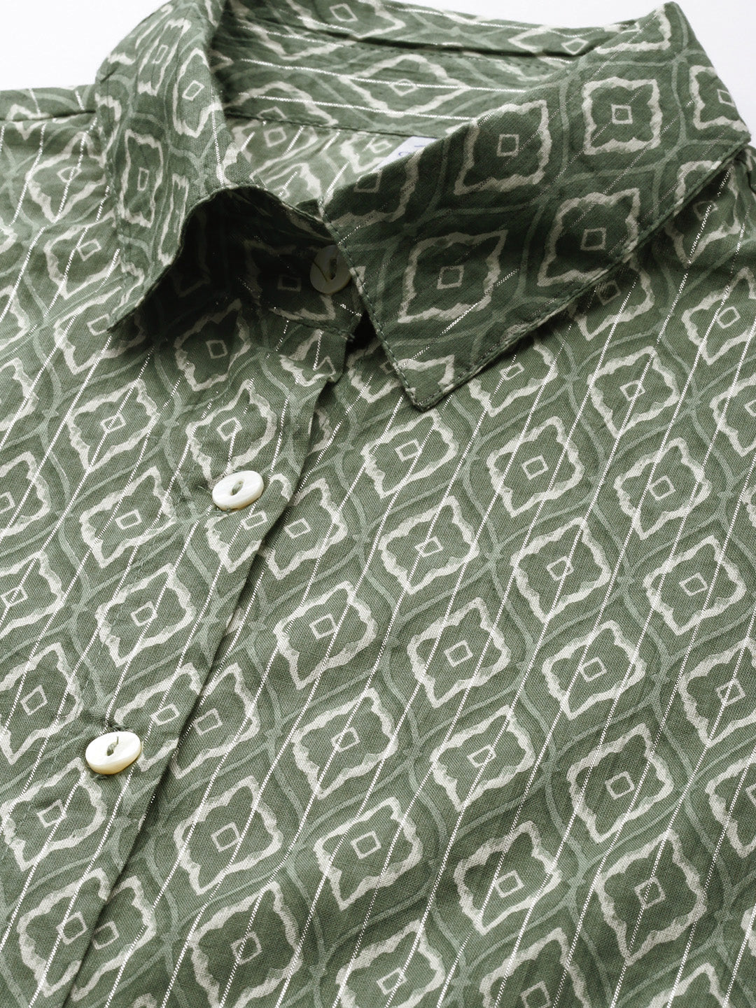 Green and beige printed Shirt, has shirt collar, three-quarter sleeves, button closure regular waist hem