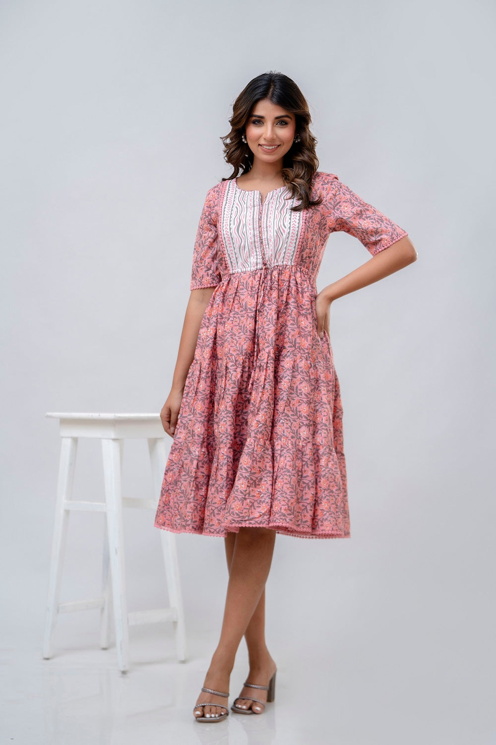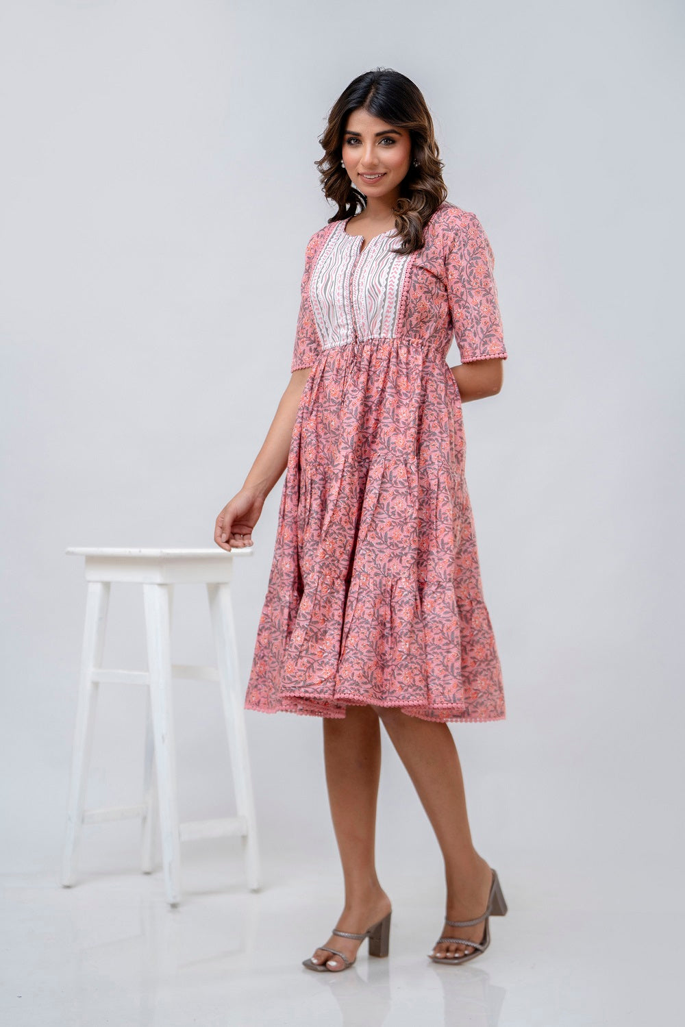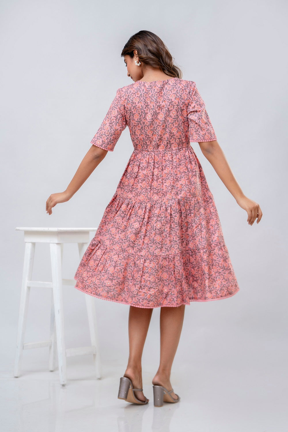 Product Details  Pink & grey colour dress Floral printed Fit and flared Shaped V- neck Short, regular sleeves Flared hem Slip-on closure Material & Care Viscose RayonFirst Wash Hand WashMachine Wash...