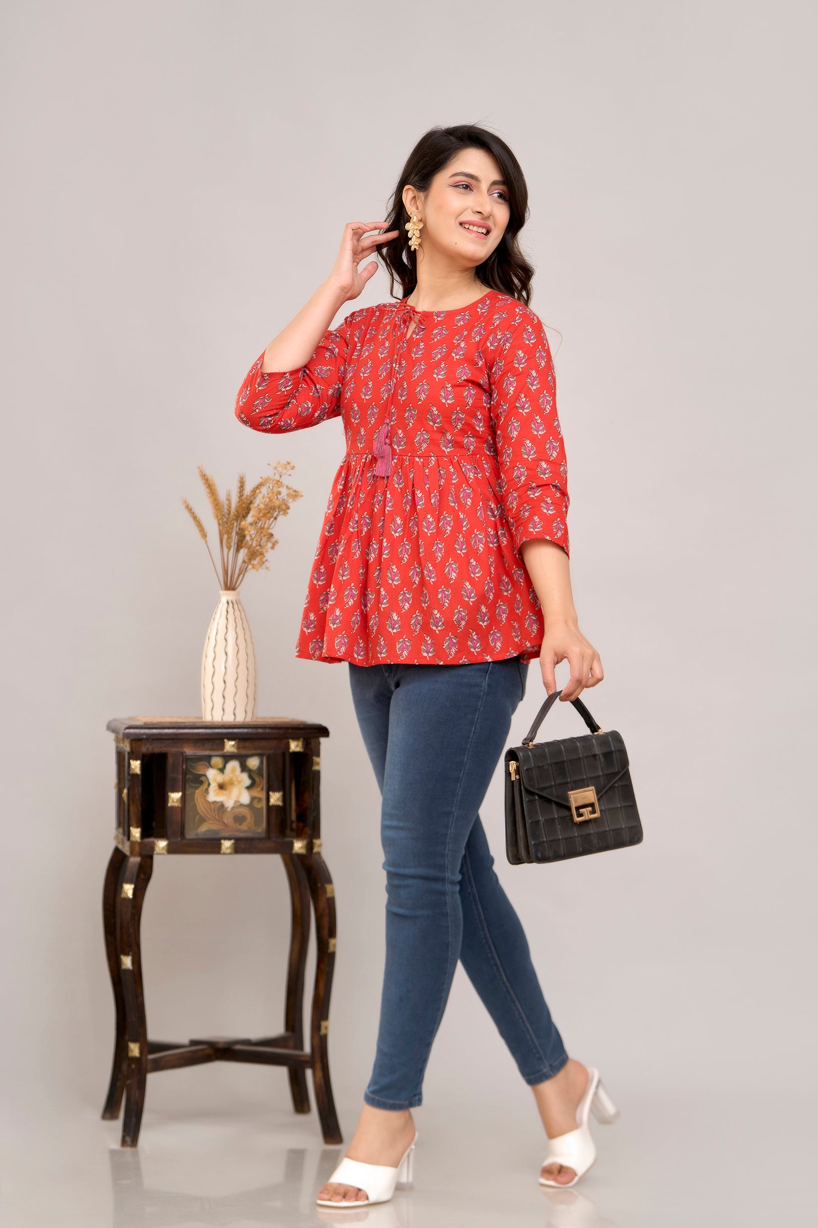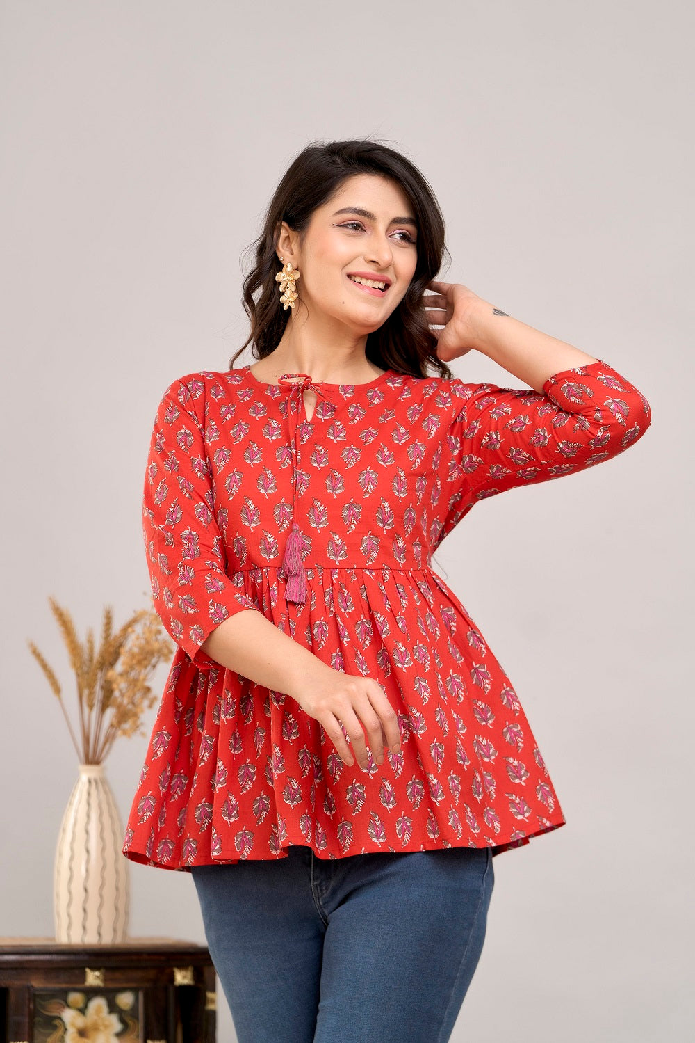 Product Details  Red regular empire top Ethnic motifs print Round neck, three-quarter, regular sleeves Gathered or pleated detail Knitted cotton Tie-ups closure Material & Care CottonMachine Wash Specifications Sleeve Length:...