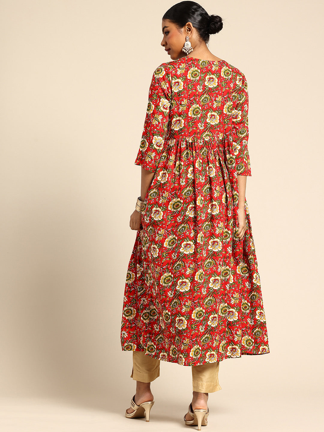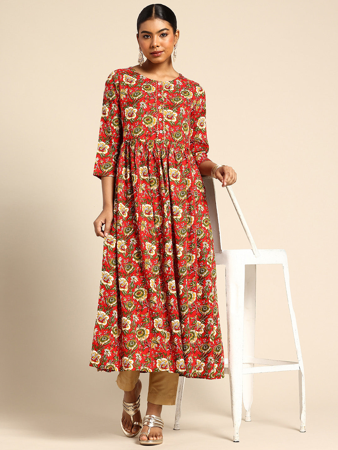 Product Details  Colour: red and mustard yellow Floral printed Round neck Three-quarter, regular sleeves A-line shape with empire style Gotta patti detail Calf length with flared hem Machine weave regular...