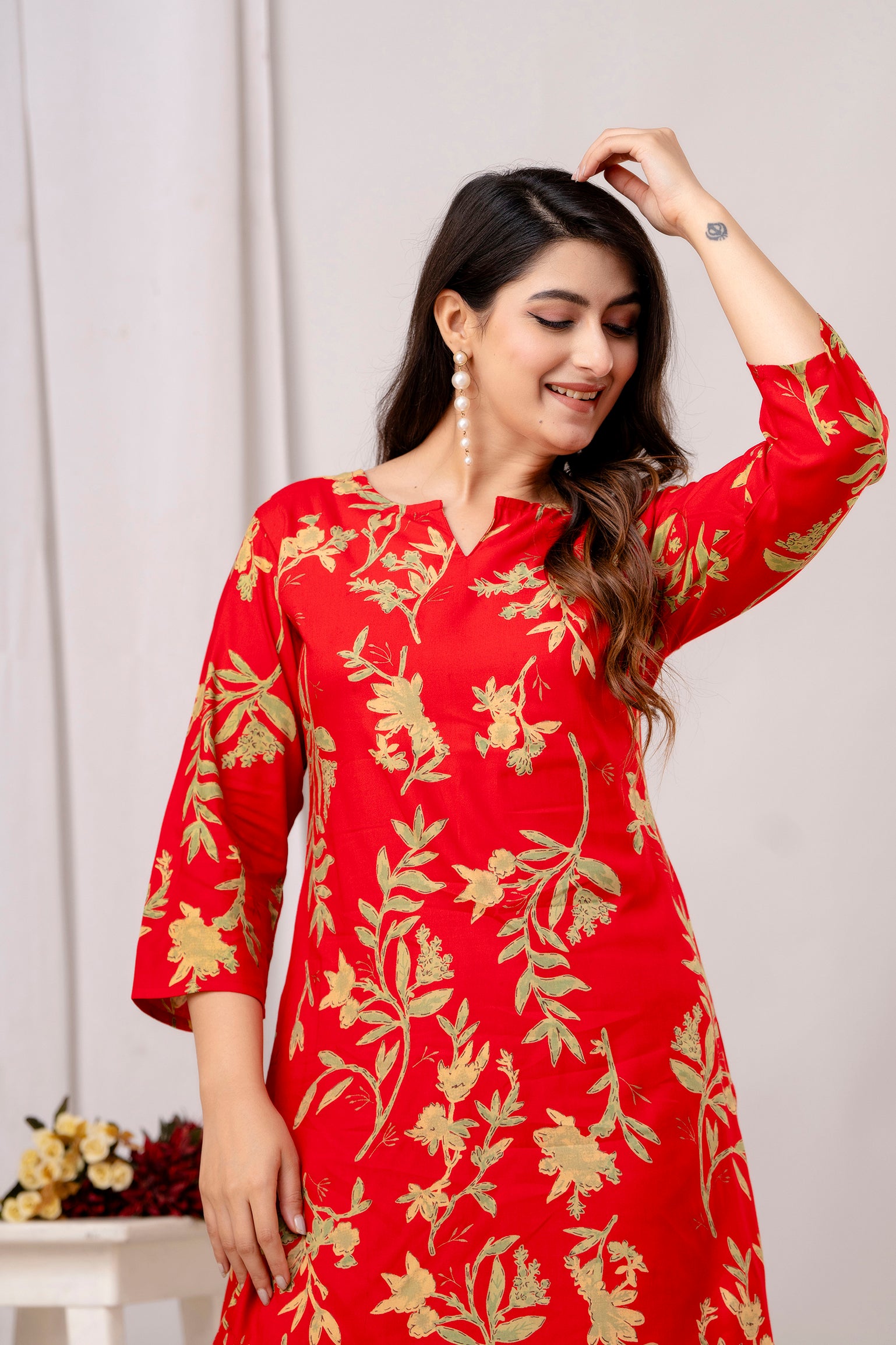 Product Details  This co-ords consists of Top and palazzoRed and beige printed Top has Round Neck collar, Three quarter Sleeves, Slip-on closure regular waist hem, Red and beige  printed mid-rise...