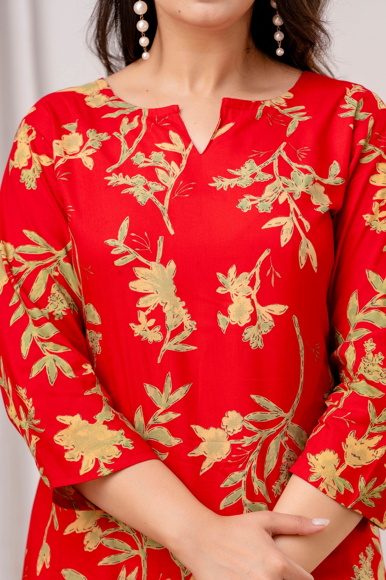 Red and beige printed Top has Round Neck collar, Three quarter Sleeves, Slip-on closure regular waist hem, Red and beige  printed mid-rise palazzo, slip-on closure