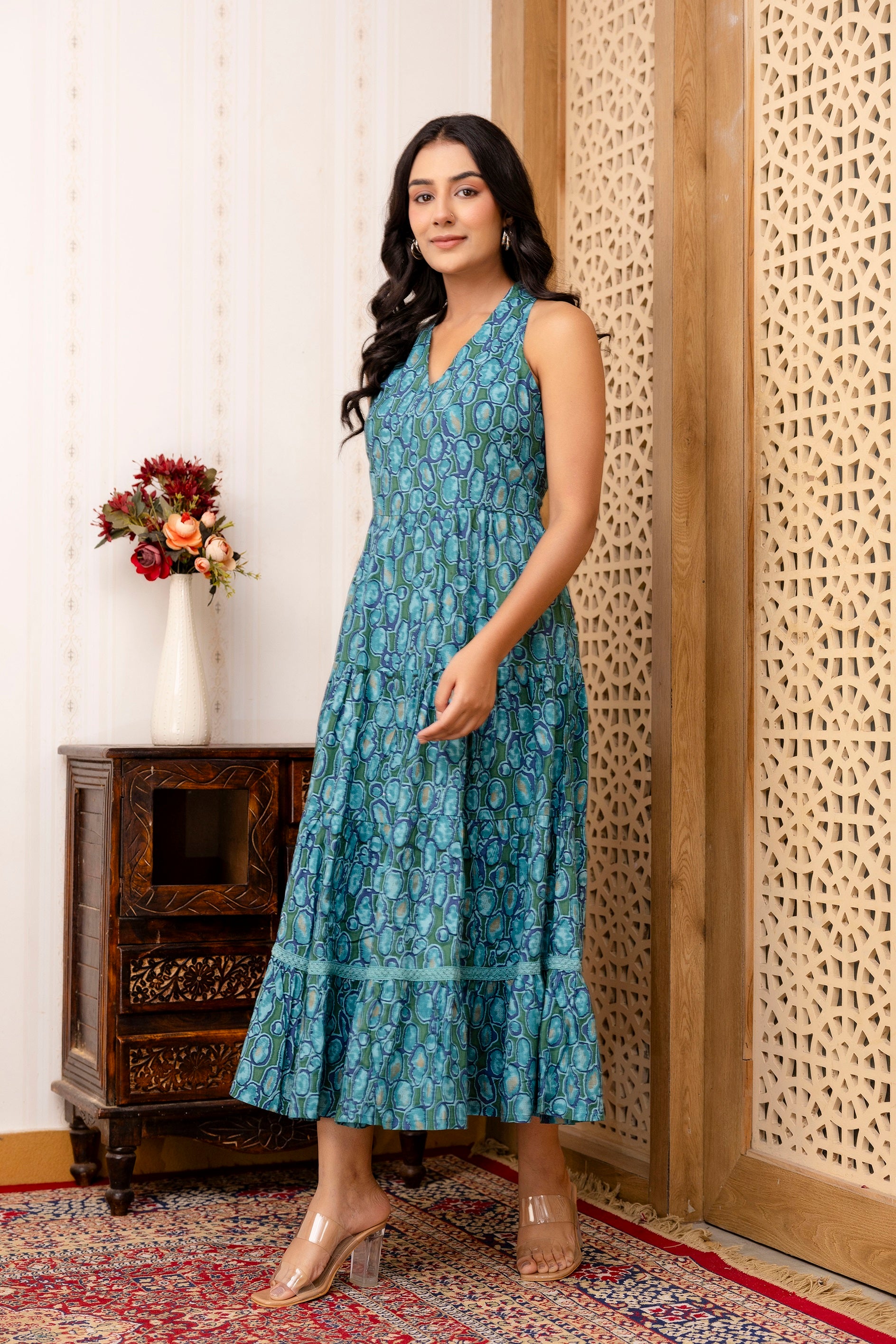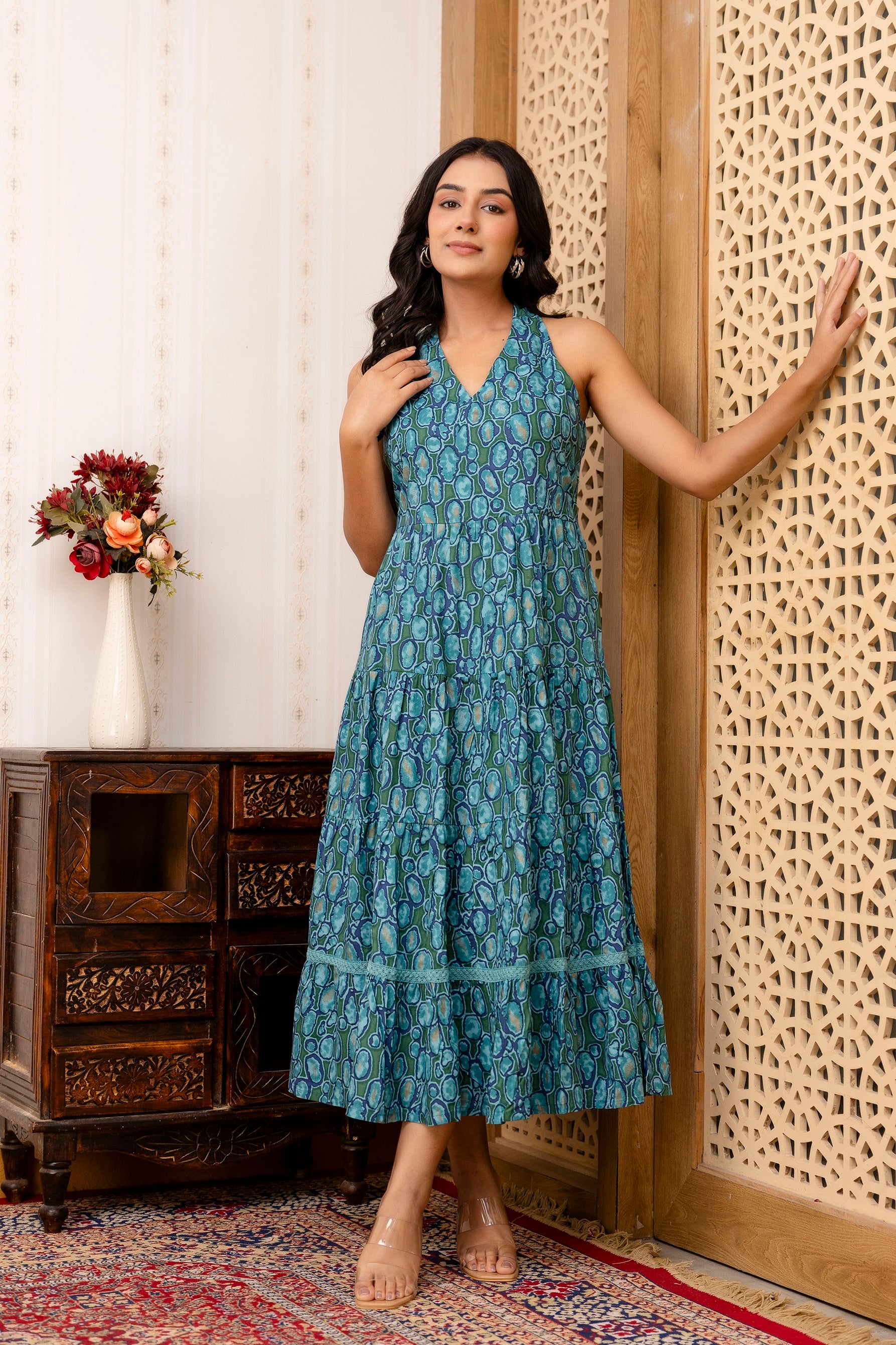 Product Details  Sea-green and beige Dress Printed Midi dress V- neck Sleeveless Flared hem Slip-on closure Material & Care Viscose RayonMachine Wash Specifications Shape: Fit and Flare Neck: V-Neck Length:...
