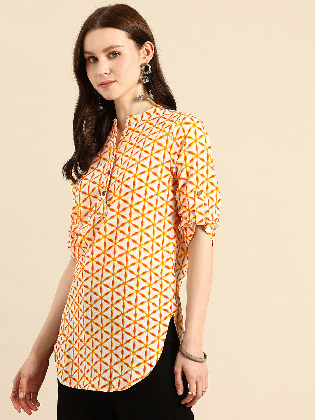 Product Details  Yellow and white longline regular top Geometric print Mandarin collar, short, roll-up sleeves  Woven Button closure Material & Care 100% Cotton Machine Wash Specifications Sleeve Length: Short Sleeves Neck:...