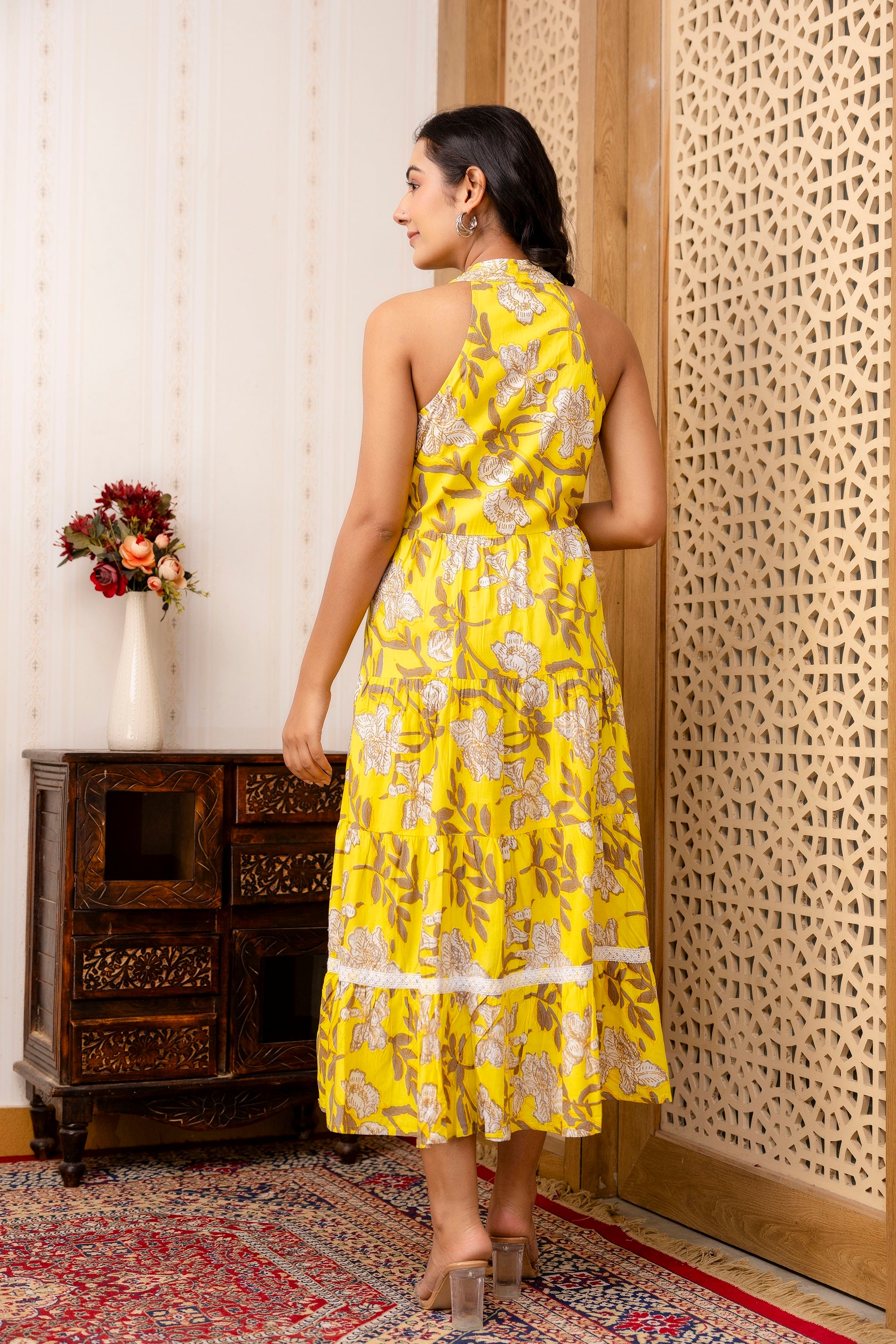 Product Details  Yellow, white and mauve Dress Floral Printed Midi Shaped V- neck Sleeveless Flared hem Slip-on closure Material & Care Viscose RayonMachine Wash Specifications Shape: Fit and Flare Neck: V-Neck...
